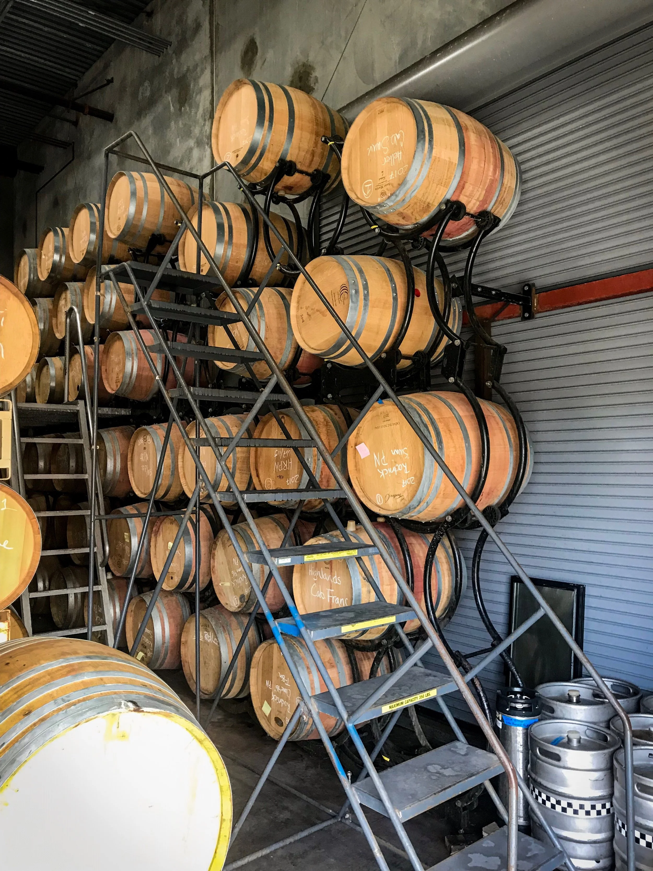 As for us, showing up on bottling day turned into quite the eye-opening experience. We walked into the warehouse, where a trailer that had an entire machine inside of it was parked right outside. The trailer has a hose that connects to the tanks that are now full of wine, and an assembly line is waiting inside the trailer. At the start of the line, there’s someone who dumps the box of empty bottles onto the line. The machine grabs each bottle, sparges them with nitrogen to replace the air, fills them, corks them, then spits them out into the middle of the trailer, where two people stand waiting to cap the foil on every bottle. After that, the bottles go through the other side of the machine, where the foil is pressed around the bottle head and the label is attached. At the end of the line, two people wait for every bottle to put back into the empty boxes, then send them down a chute where two other people wait to stack them on the pallets and get them ready for shipping.
