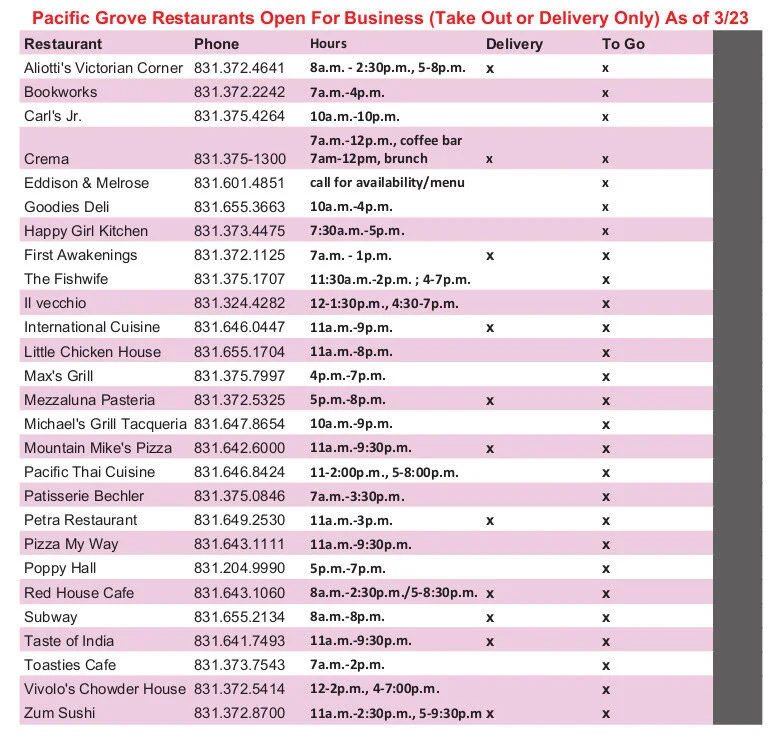 We’ve been working hard to put together a list of food & drink related small businesses in Monterey County (and a few in Santa Cruz County) that are open for takeout or delivery. The list is still a work in progress, but we want to go ahead and share what we have so far. The list is going to be constantly changing and we by no means have everyone on the list. That’s where we can use your help! Leave us a comment below if you know of a business we left out and what they are offering and we will update our list as soon as possible.